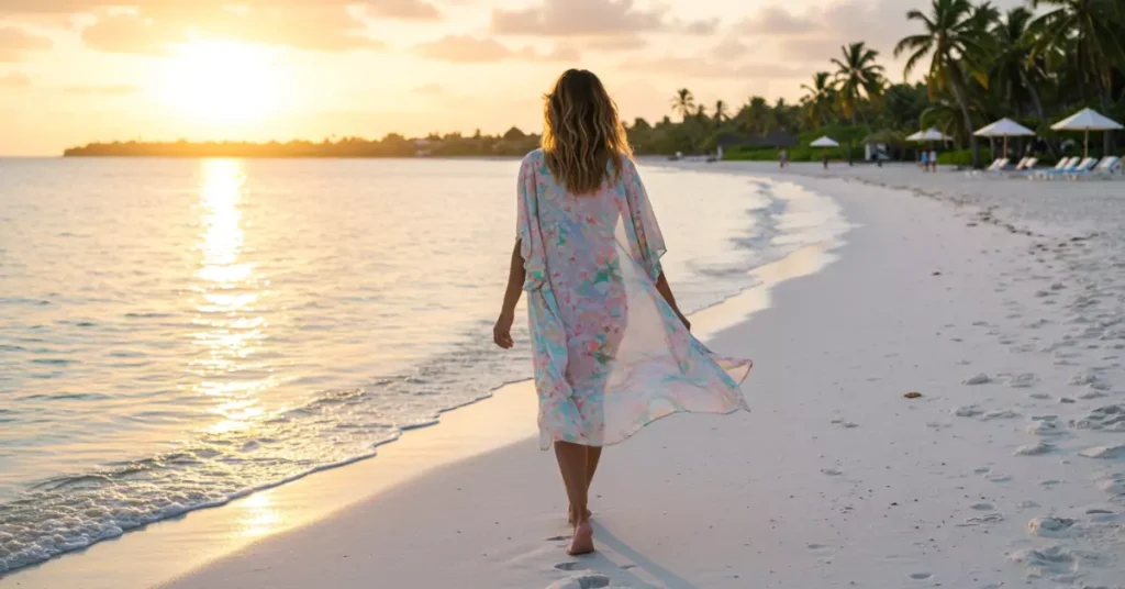During the day, a kimono pairs with swimsuits or casual wear. At night, it becomes an elegant wrap for dinner by the shore.