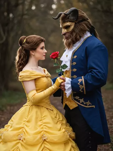 The Beast can go with a velvet suit jacket, ruffled shirt, and a simple mask or furry accessories. You don’t need to go heavy on makeup just enough to suggest the “beastly” look. Together, you’ll look enchanting and ready to waltz the night away.