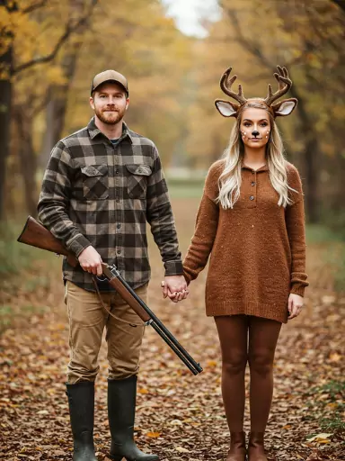 This one’s rustic and charming. The hunter can wear a flannel shirt, boots, and a toy rifle, while the deer wears soft brown clothing, antlers, and face paint for a cute nose and spots.