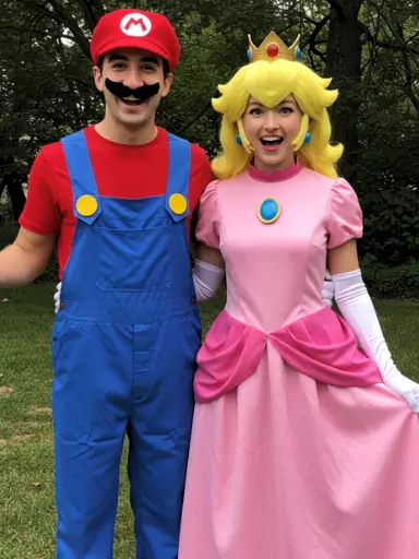 Step into the world of Nintendo with this classic duo. One of you can rock blue overalls, a red cap, and a fake mustache for Mario, while the other shines in a pink gown, white gloves, and a crown as Peach.