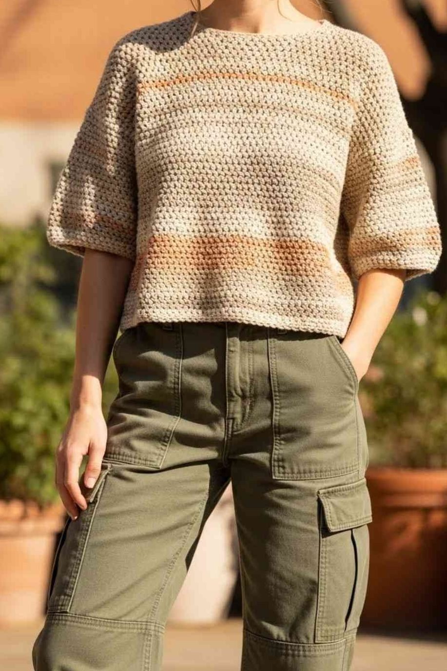 A boxy crochet top gives a clean, square shape. It works surprisingly well with cargo pants. The texture of the top balances the pockets and structure of the pants. Choose soft colors for a calm look or darker shades for a stronger style.
