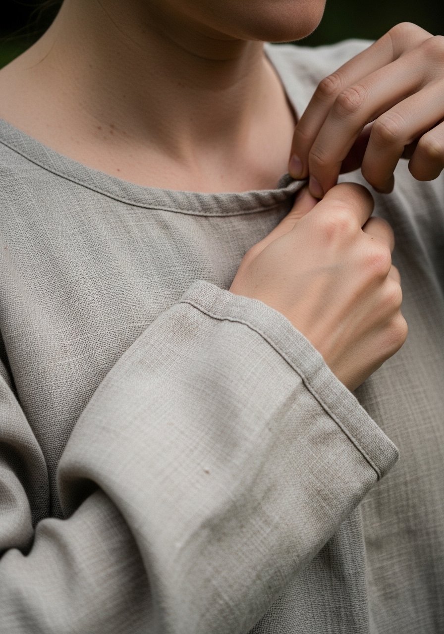 I always begin with the chemise. It’s the foundation that makes the rest sit right. Choose a simple natural linen that’s breathable and not too stiff.