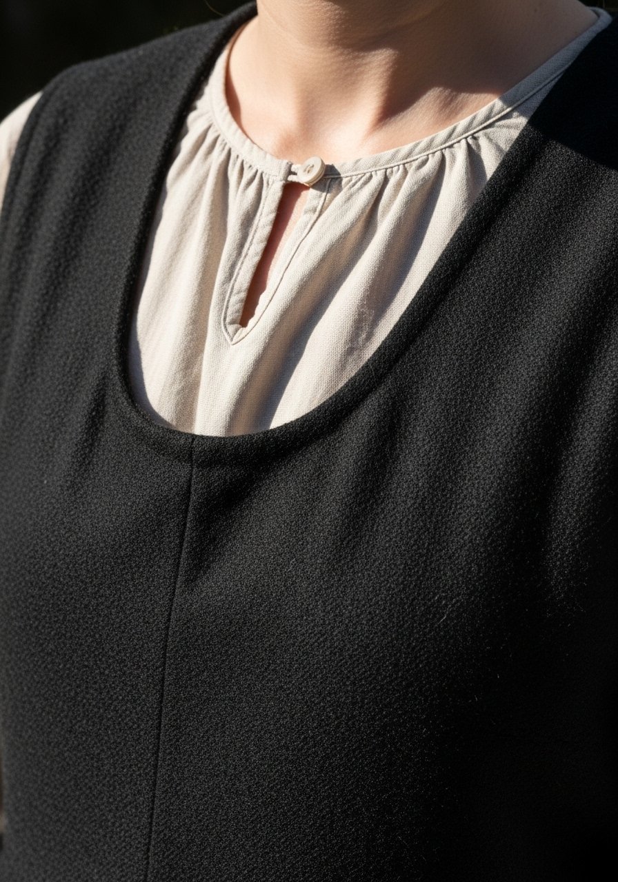 Visually, a neat chemise smooths the shoulders and gives the overdress something to hang from. People often miss sleeve length—too long sleeves ruin the line. Avoid a bulky undershirt; it hides the dress’s shape and makes the waist float.