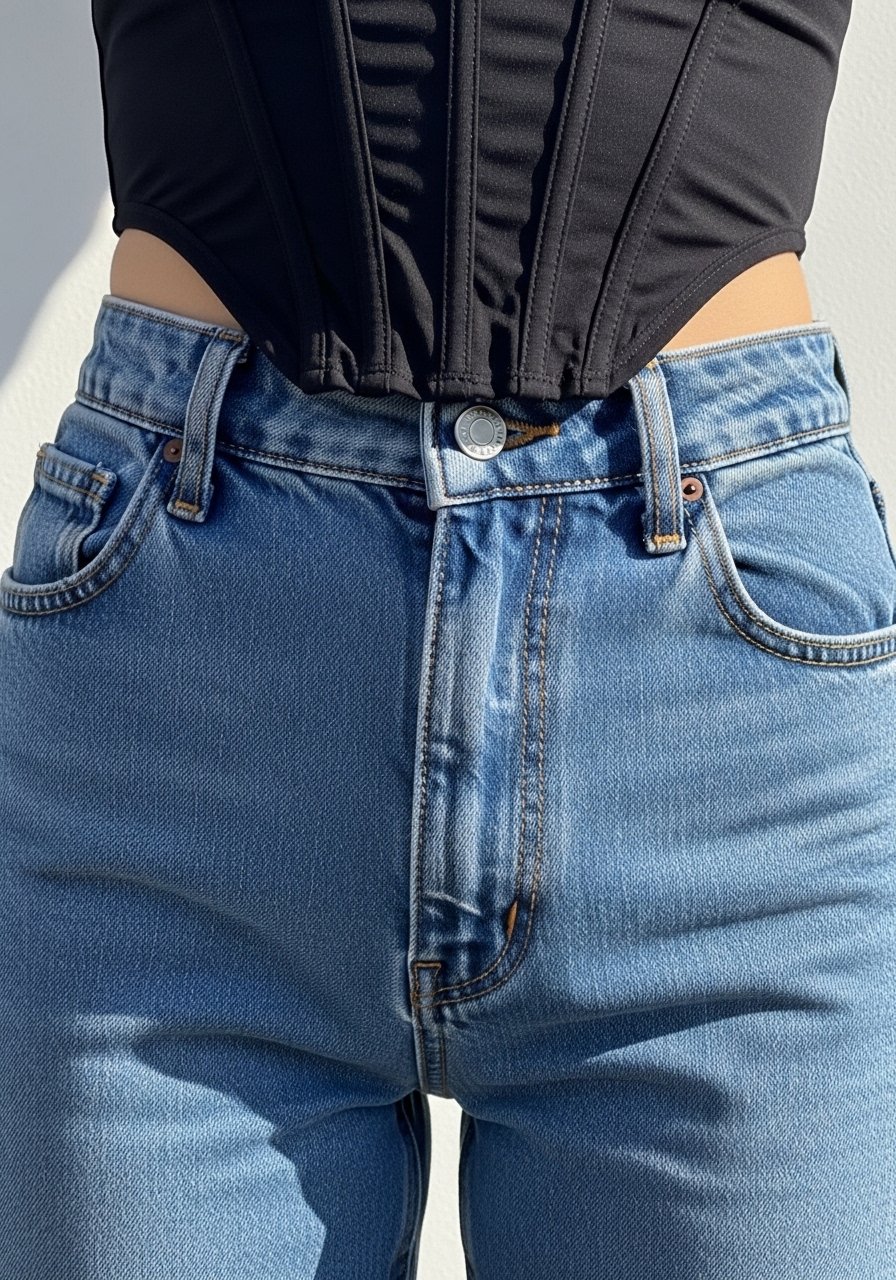 I choose high-rise bottoms to echo the corset’s waistline. High-rise straight jeans keep the balance between structured top and relaxed leg. A-line skirts work the same way when I want a softer lower half.