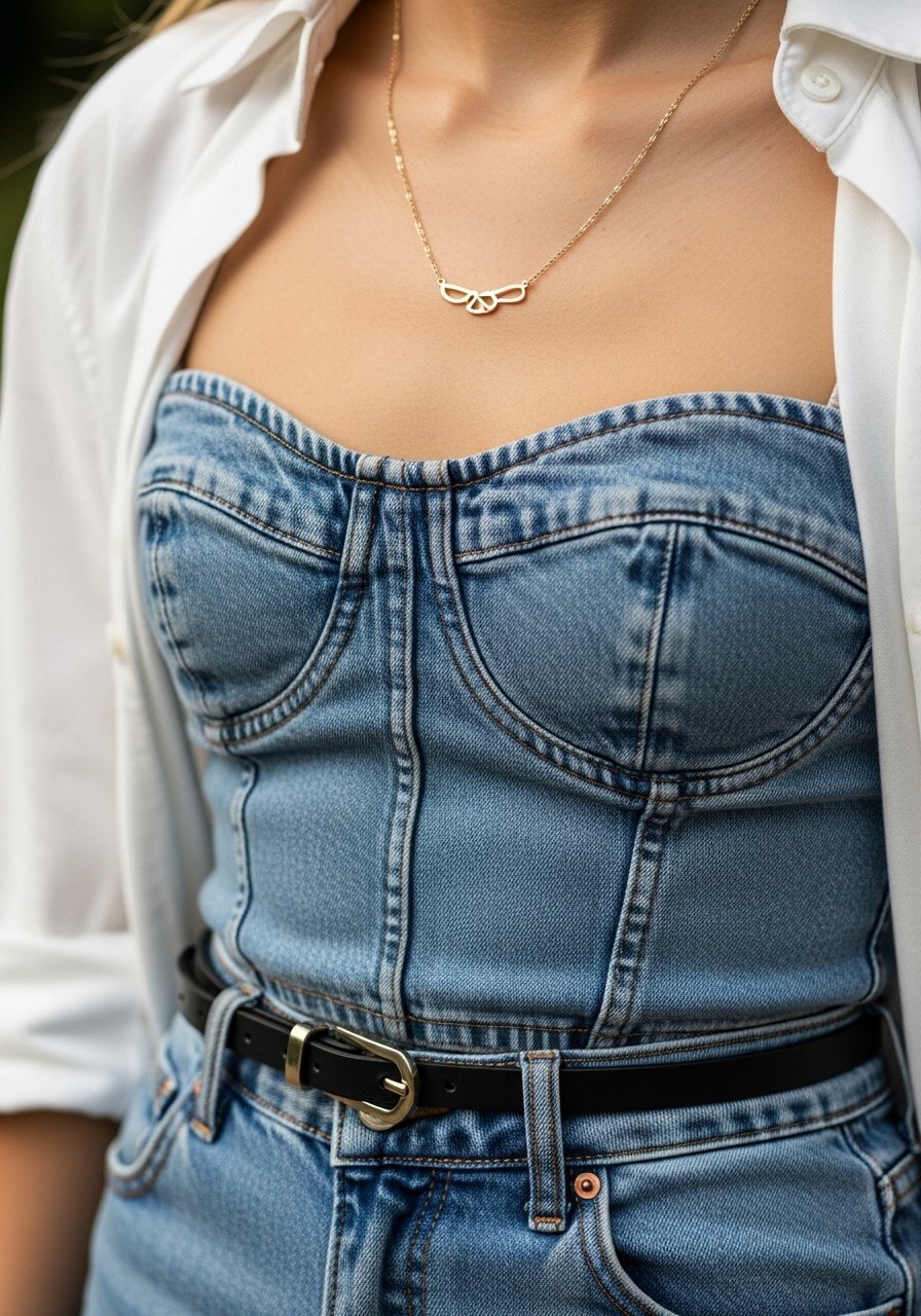 I keep jewelry minimal. A short gold chain and small hoops feel right. I add a slim belt only if the corset has loops or the jeans need definition.