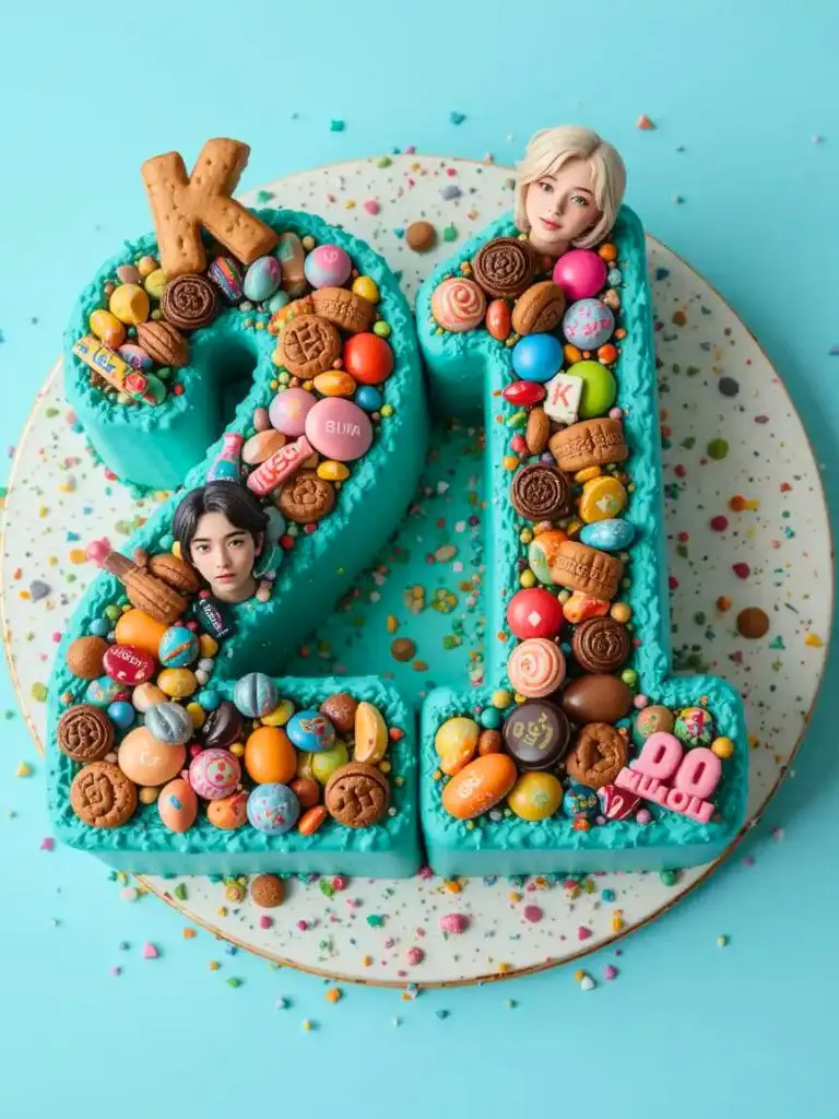 Highlight the big day with a cake shaped like the birthday number—like “21” for your idol’s milestone—decked out with K-pop flair, such as group logos or tiny BT21 toppers.