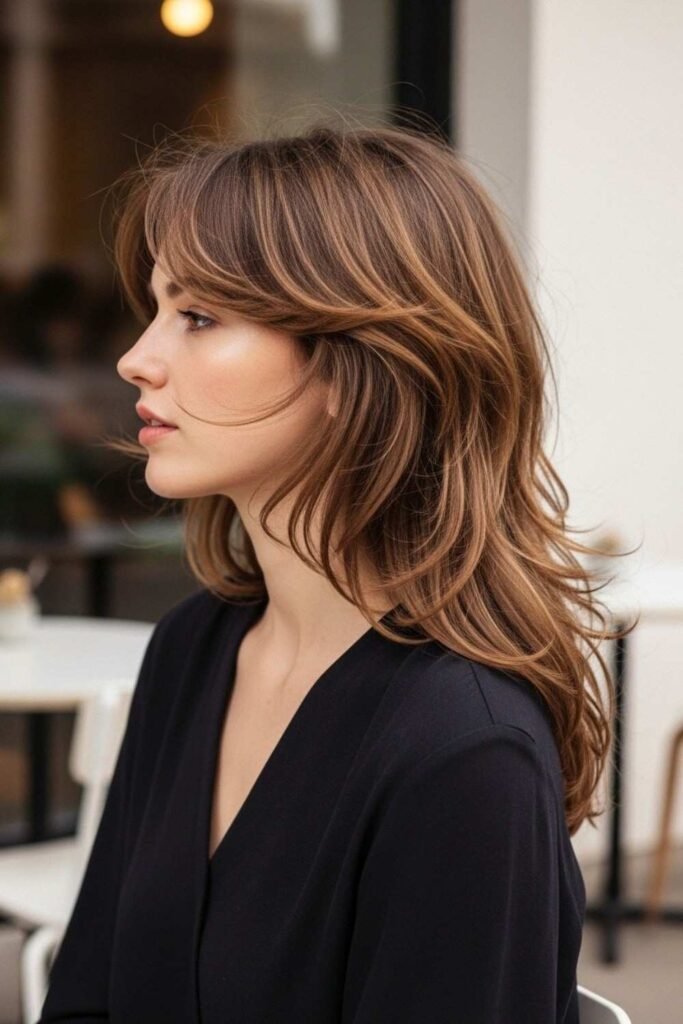 For anyone who wants a modern long mullet hairstyle for women, this mix of bangs and layers creates a stylish everyday look.