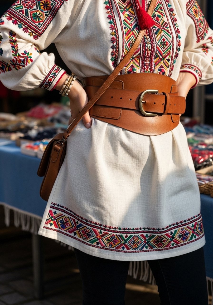 I love the tunic’s detail—embroidered sleeves feel handcrafted. The wide belt anchors the look and provides shape without being fussy.