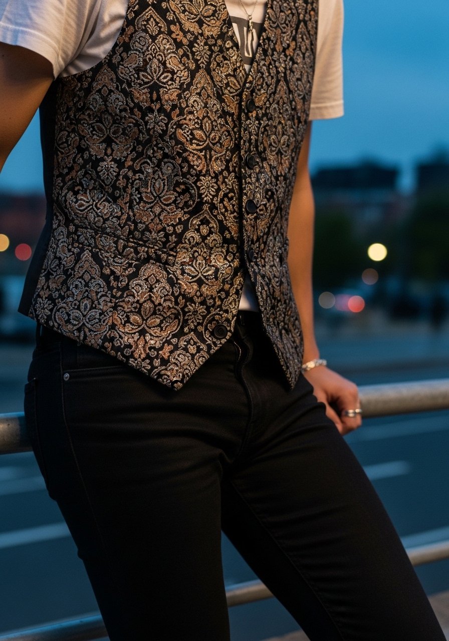 19. Brocade Waistcoat with Slim Black Jeans