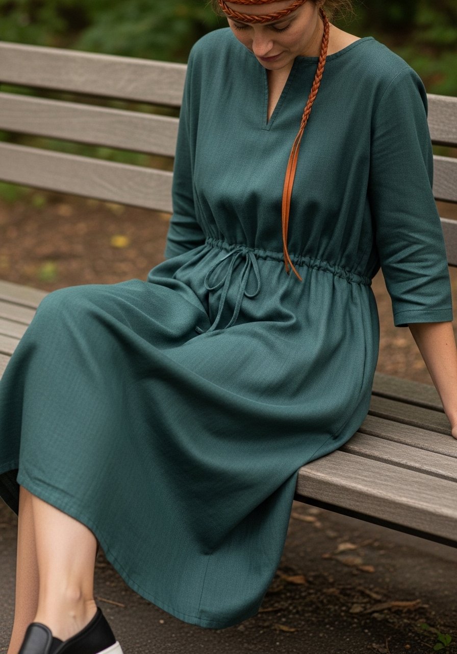 I pull this dress on when I want comfort and shape. The drawstring lets you choose how fitted you feel that day. The headband keeps hair off my face and reads medieval without ceremony.