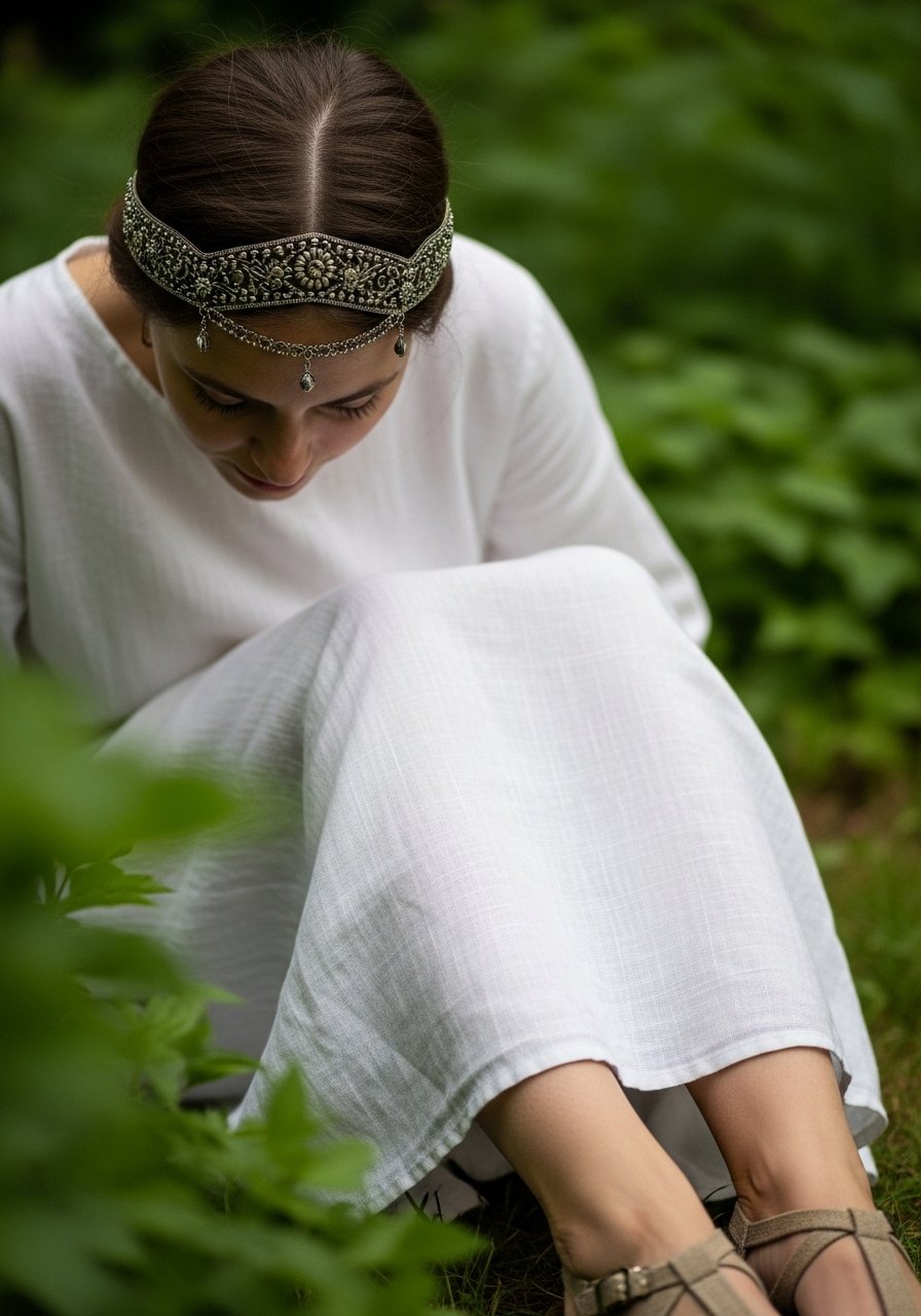 Sometimes accessories sell the story. An embellished headband makes a plain dress feel intentional and slightly historic. I wore this to a small gathering and felt comfortable and special.