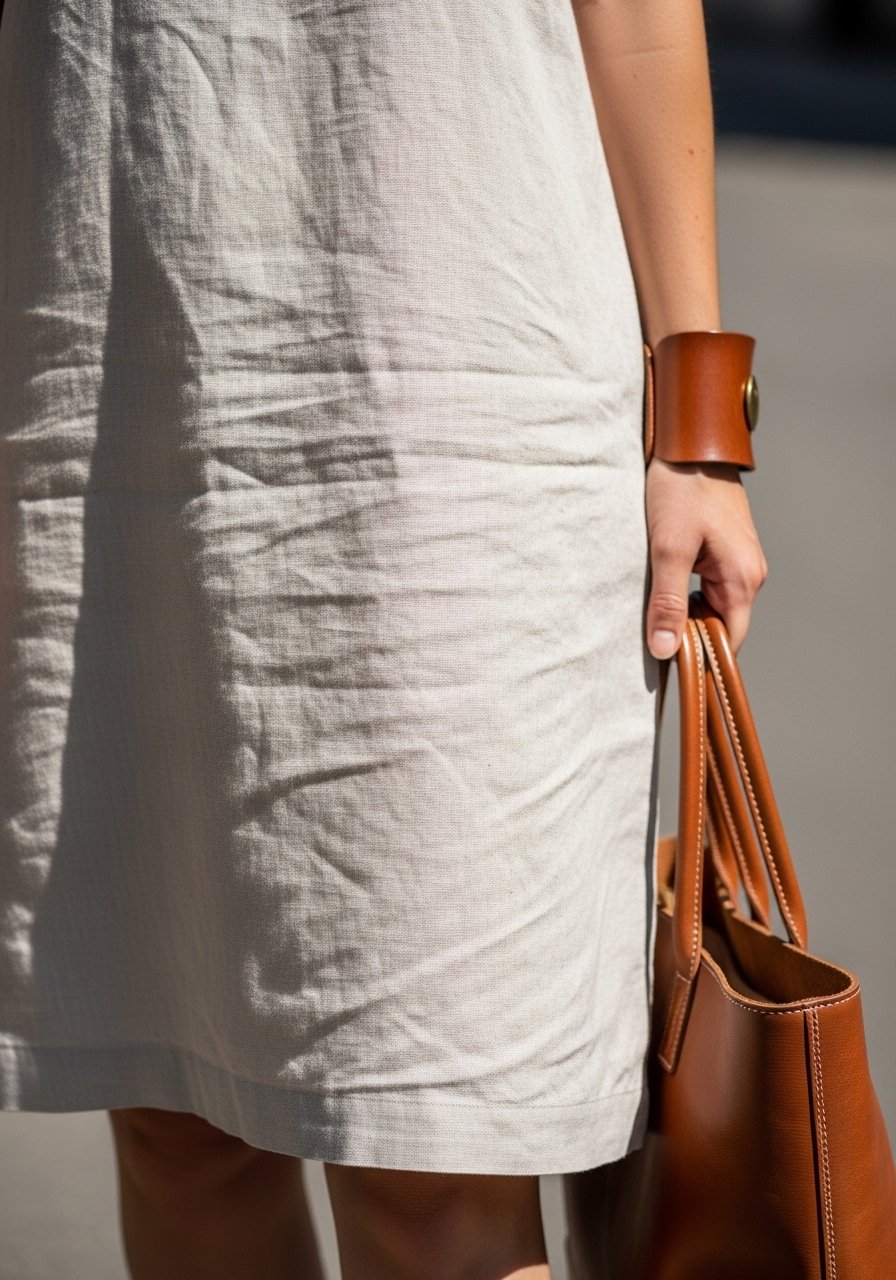 27. Simple Linen Shift with Leather Cuff and Tote