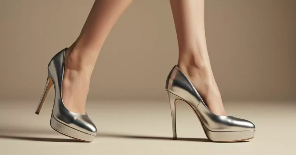 Metallic heels come in every style, from classic silver stilettos to bold holographic sandals. They’re the kind of shoe that makes even simple outfits feel special.