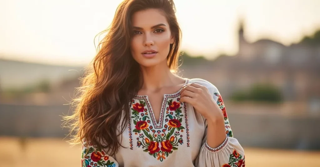 An embroidered peasant top is a wearable piece of art. Bright threads, floral motifs, and geometric patterns give it a distinct bohemian edge.