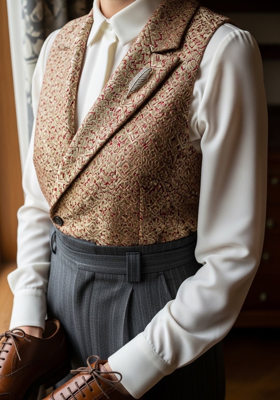 5. Brocade waistcoat over a crisp blouse with high-waist trousers