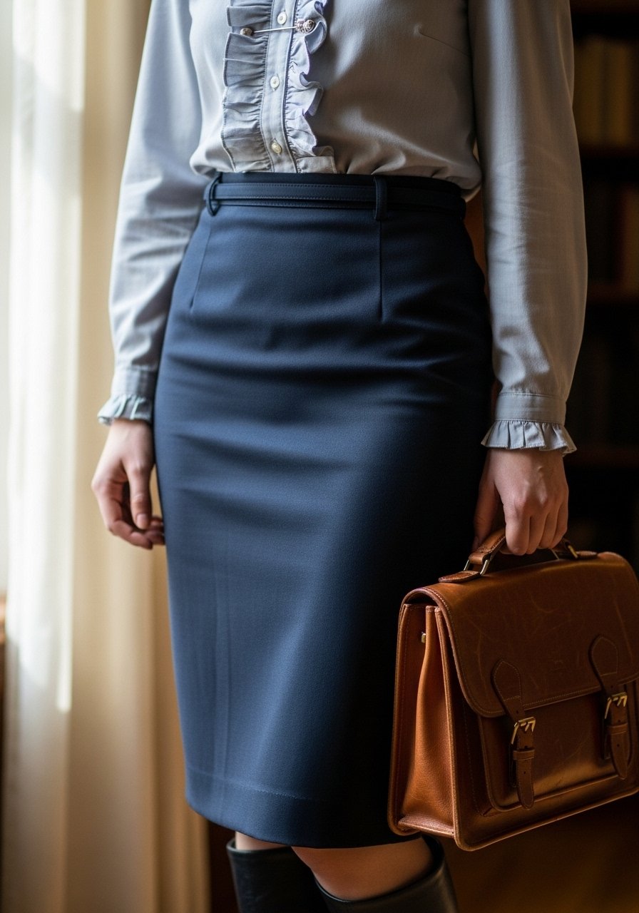 A pencil skirt maintains polish. Mid-heel boots are comfortable for commuting.