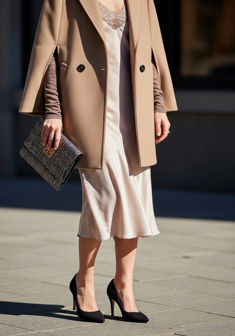 I pull out a cape coat for dates or dinners. It gives the line of a cloak without being heavy. The slip dress underneath keeps it feminine.