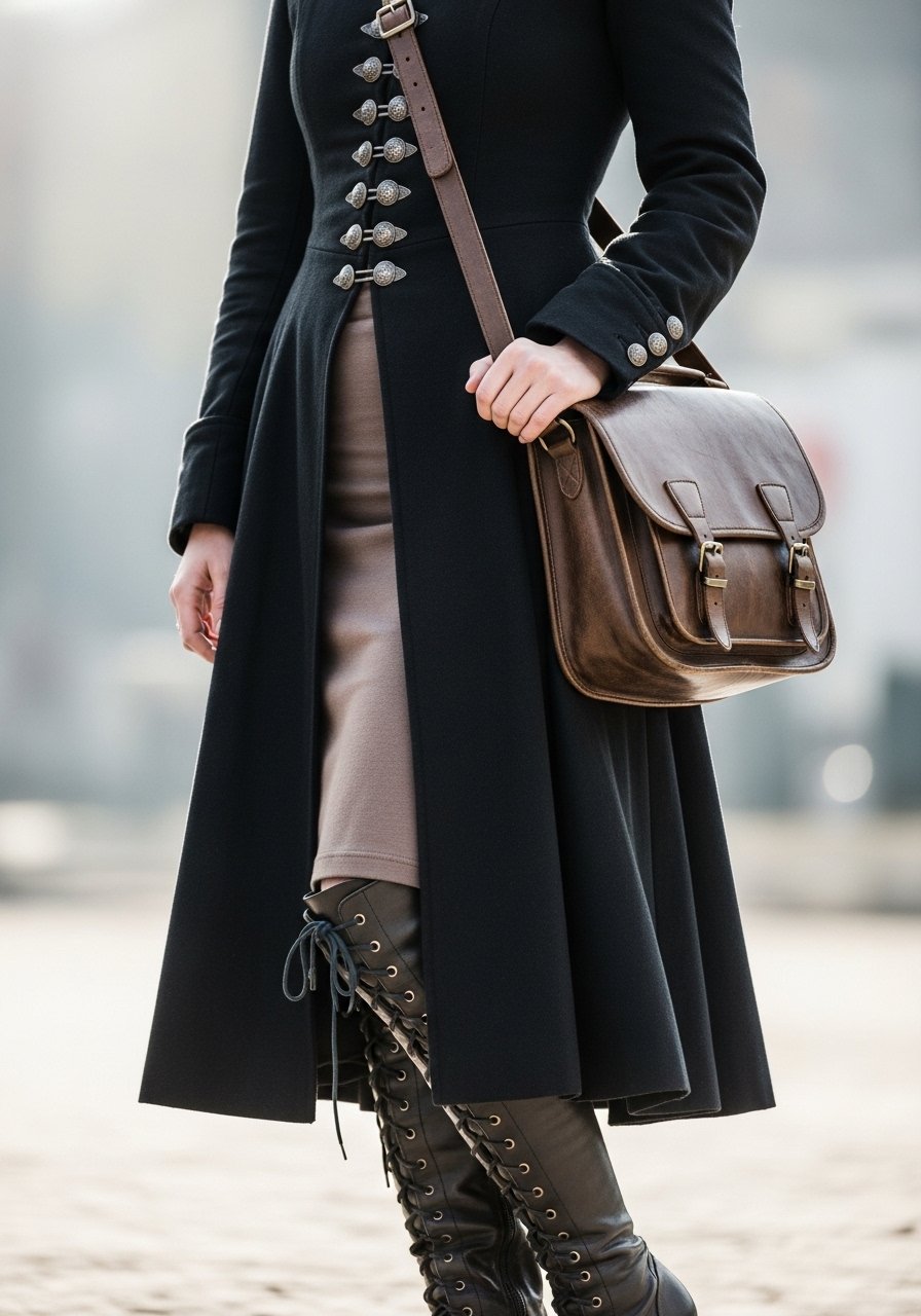 A slim dress underneath prevents bulk. Lace-up boots add a walking-friendly Victorian edge.
