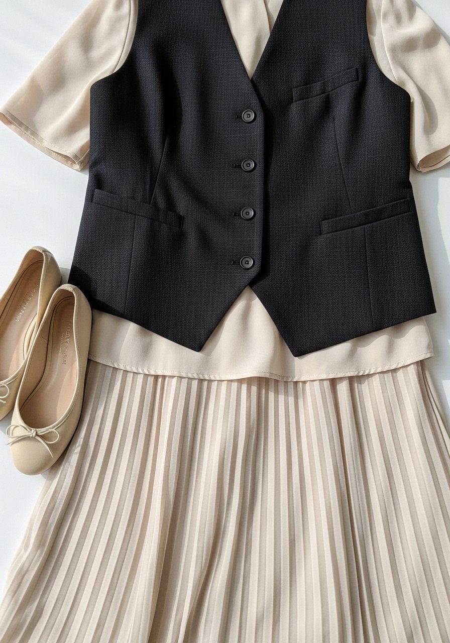 15. Tailored waistcoat with a pleated midi skirt and simple blouse