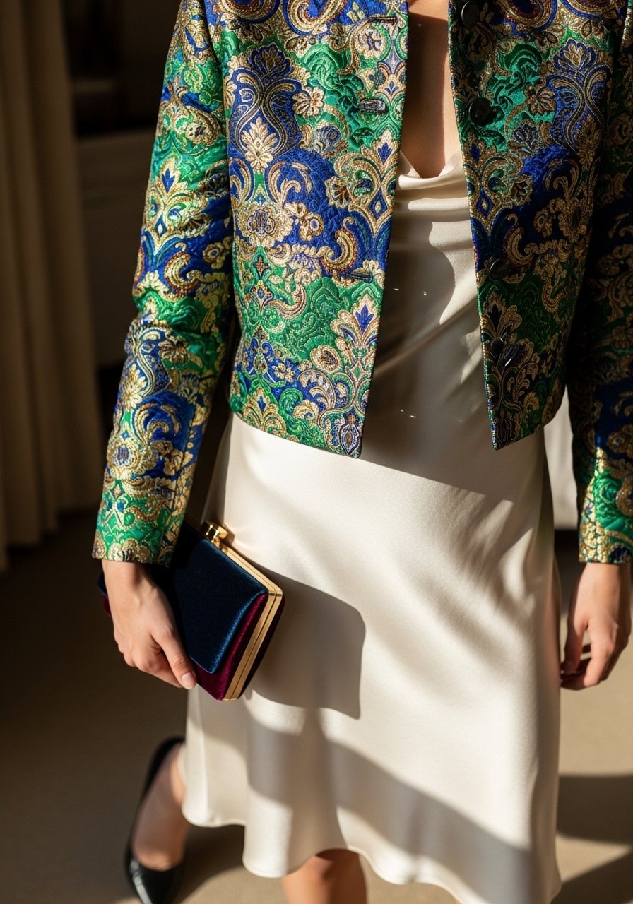 A cropped brocade jacket is my answer when I want texture without bulk. It frames the waist and makes a slip dress feel seasonless.