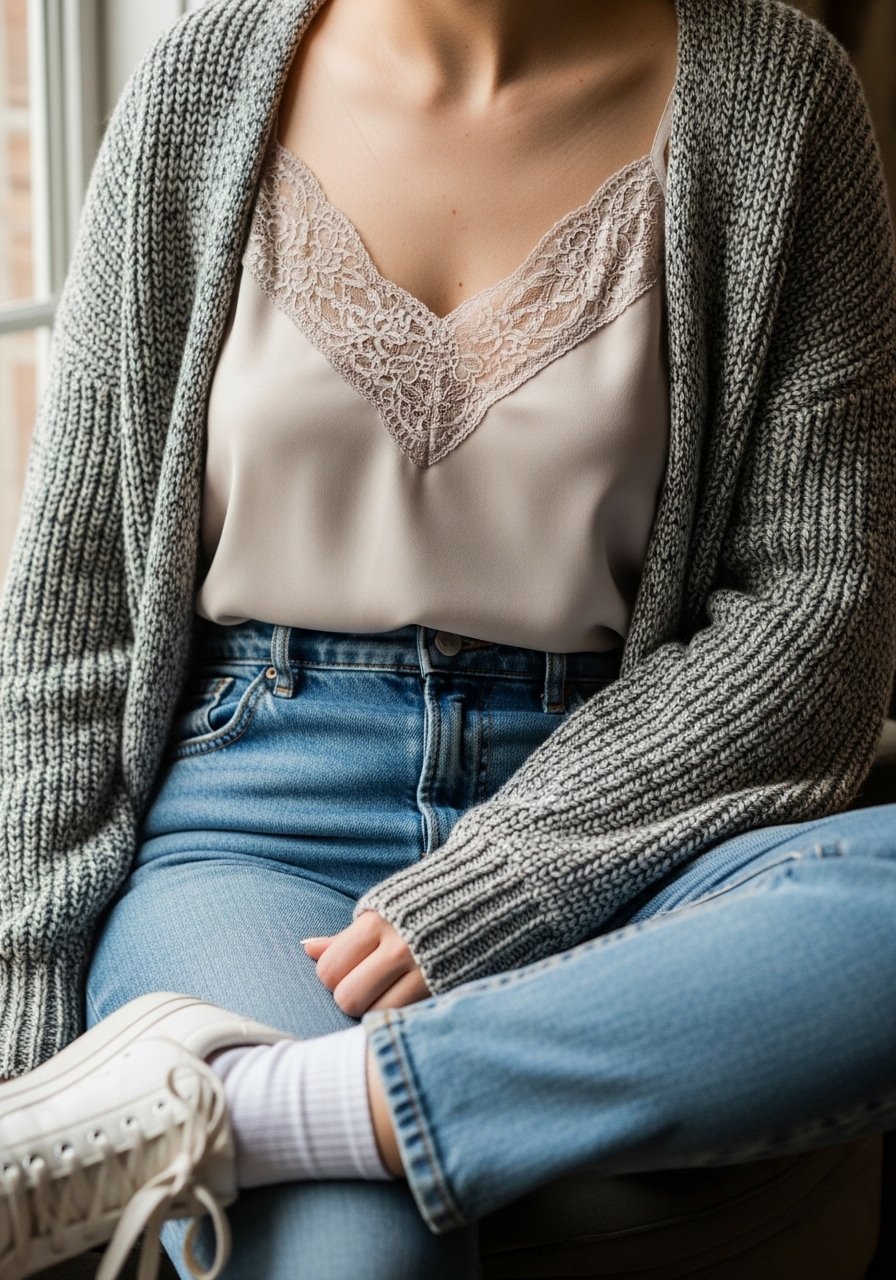 19. Lace-trim camisole under a soft cardigan and high-waist jeans