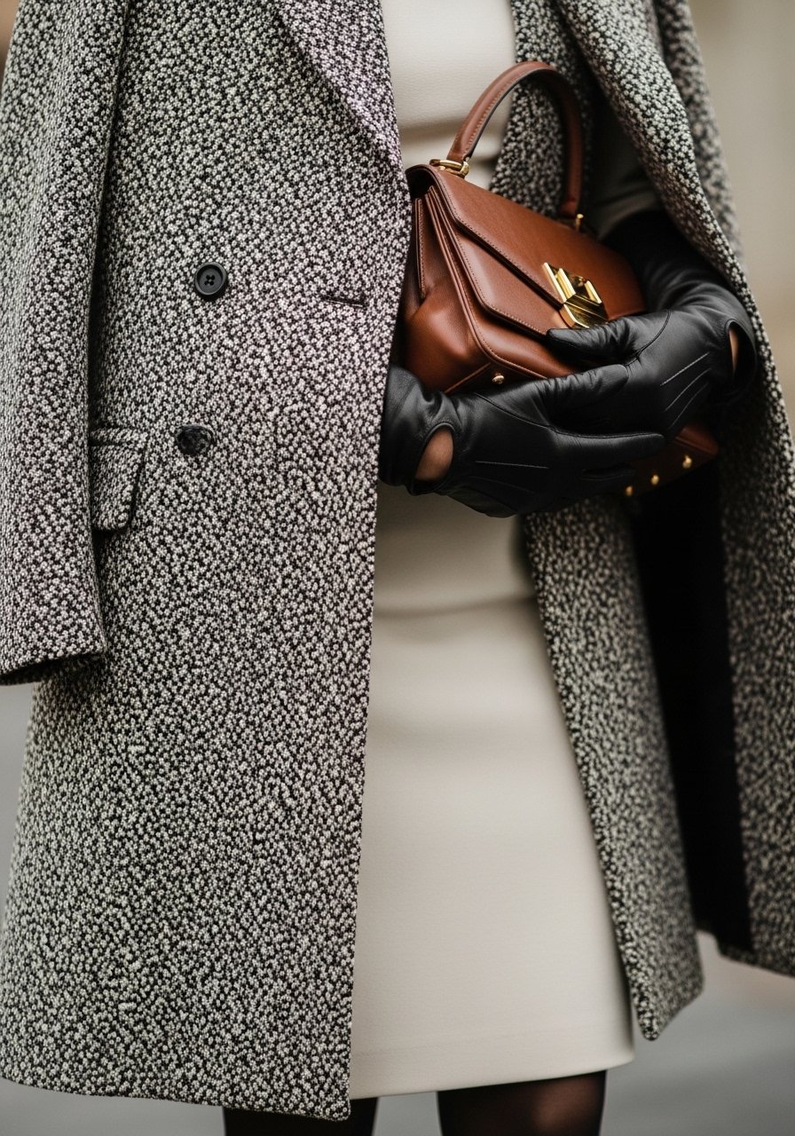 20. Jacquard coat over a clean sheath dress and leather gloves
