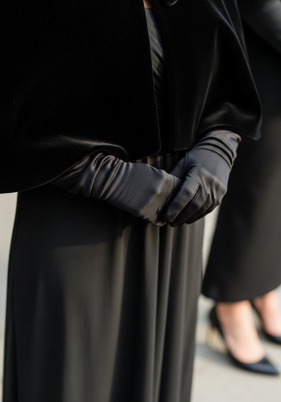 24. Velvet capelet over an evening dress with simple gloves and classic heels